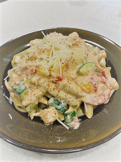 Here is the finished pasta all melted together. So good and filling! I plated this up and added a little sprinkle of shredded parmesan cheese & a side salad for balance. So good and comforting.